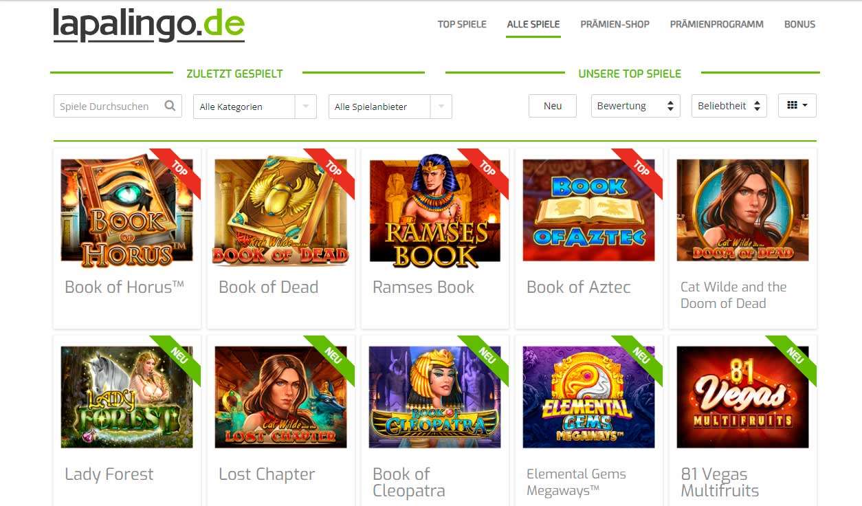 Wir loben nochmals besonders den praktischen Filter, welcher die Suche nach Automaten und anderen Favoriten sehr vereinfacht. Sie können sogar nach “Bücherslots” suchen und spüren sekundenschnell weltberühmte Slotspiele wie Book of Dead und Book of Ra auf. Davon abgesehen, dass auch Sportsbook in das Lapalingo Glücksspielportal integriert wurde, gibt es im Bereich Online Spieleplattform allerhand zu entdecken.