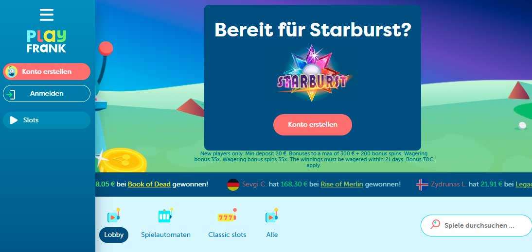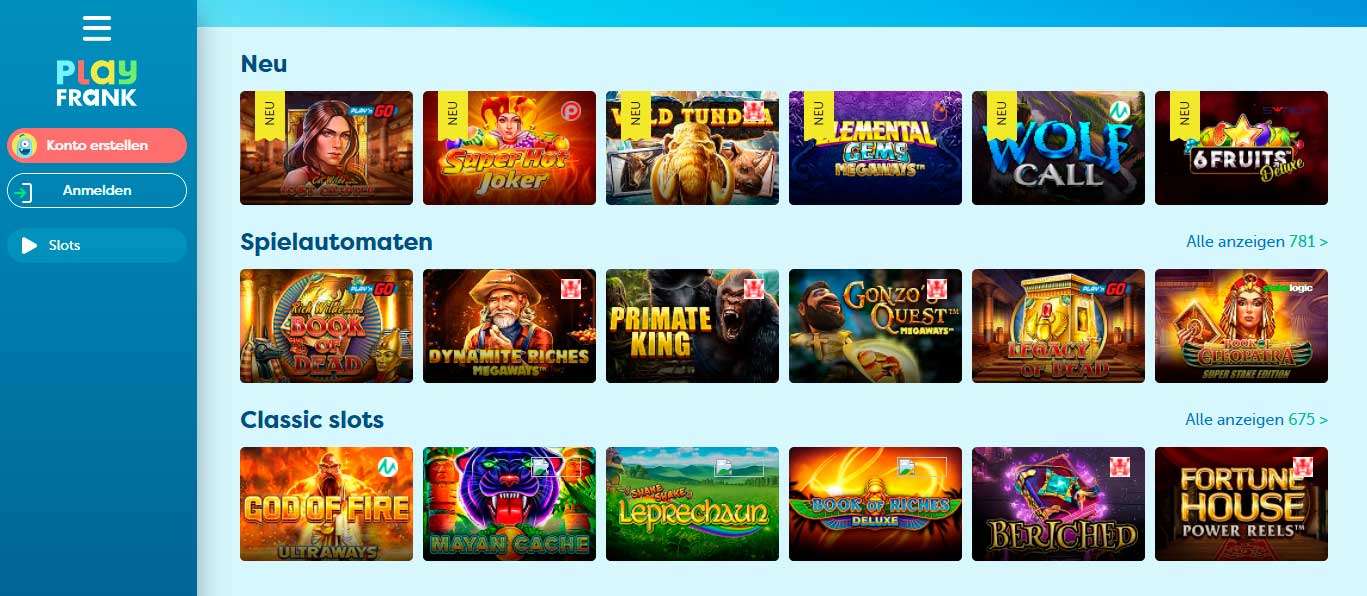 Wir hatten Spaß beim Play Frank Test, denn es hat eine große Auswahl an Spielen zur Auswahl, die in verschiedenen Kategorien angeordnet sind, nämlich Online-Slots, Tischspiele, Live Casino, Jackpot, klassische Slots und andere. Die Desktop-Version der Seite hat mehr als 2000 Spiele.